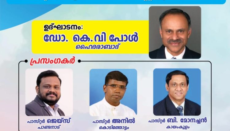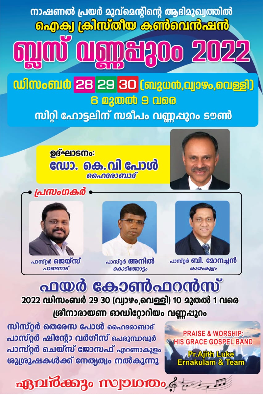 വണ്ണപ്പുറം: നാഷണൽ പ്രയർ മൂവ്മെന്റിന്റെ ആഭിമുഖ്യത്തിൽ ഐക്യ ക്രിസ്തീയ കൺവെൻഷൻ ബ്ലെസ് വണ്ണപ്പുറം 2022 ഇന്ന് മുതൽ (ഡിസംബർ 28) ആരംഭിക്കുന്നു ഡിസംബർ 28,29,30 തീയതികളിൽ വൈകുന്നേരം 6 മുതൽ 9 വരെ വണ്ണപ്പുറം സിറ്റി ഹോട്ടലിന് സമീപം നടക്കും. ഈ യോഗം ഡോ കെ വി പോൾ പ്രാർത്ഥിച്ച് ഉദ്ഘാടനം ചെയ്യുകയും അനുഗ്രഹീതരായ പാസ്റ്റർ ജെയ്സ് പാണ്ടനാട്,പാസ്റ്റർ അനിൽ കോടിത്തോട്ടം, പാസ്റ്റർ ബി മോനച്ചൻ കായംകുളം എന്നിവർ ഈ ദിവസങ്ങളിൽ വചനം ശുശ്രൂഷിക്കുകയും ചെയ്യും . പാസ്റ്റർ അജിത്ത് ലൂക്ക് നേതൃത്വം നൽകുന്ന ഫിസ് ഗ്രേസ് ഗോസ്പൽ ബാൻഡ് ഗാന ശുശ്രൂഷകൾക്ക് നേതൃത്വം നൽകും. ഡിസംബർ 29, 30 തീയതികളിൽ രാവിലെ 10 മുതൽ ഒരു മണി വരെ വണ്ണപ്പുറം ശ്രീനാരായണ ഓഡിറ്റോറിയത്തിൽ വച്ച് ഫയർ കോൺഫറൻസ് നടക്കും.