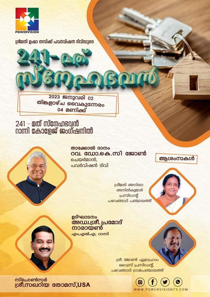 തിരുവല്ല: പവർവിഷൻ ടി വി യുടെ ചാരിറ്റി പ്രവർത്തനമായ പവർവിഷൻ ചാരിറ്റബിൾ ട്രസ്റ്റിന്റെ 241 മത് സ്നേഹഭവനം റാന്നി കോളേജ് ജങ്ഷന് സമീപം പഴവങ്ങാടി പഞ്ചായത്തിലെ വാർഡ് 09 ലെ താമസക്കരിയായ ഉഷാ തമ്പിക്ക് വേണ്ടി ഒരുങ്ങി കഴിഞ്ഞു. 2018 ലെ പ്രളയത്തിൽ സ്ഥലവും വീടും വീട്ടു സാധനങ്ങളും നഷ്ടപെട്ട ക്യാൻസർ രോഗിയായ ഉഷാ തമ്പിയും മാതാവും പ്ലാസ്റ്റിക്ക് ഷീറ്റ് മറച്ച് മഴയും നനഞ്ഞു താമസിക്കുന്ന കണ്ണുകളെ നനയിക്കുന്ന കാഴ്ച പവർവിഷൻ ടി വി യിലെ കാണാ കാഴ്ച പ്രോഗ്രാമിലൂടെ കണ്ട പ്രേക്ഷകർ ഒരുക്കിയ കൂട്ടായ്മ. 2023 ജനുവരി 02 തിങ്കളാഴ്ച വൈകുന്നേരം 04.00 മണിക്ക് റാന്നി എം എൽ എ അഡ്വ. ശ്രീ. പ്രമോദ് നാരായണൻ ഉദ്ഘാടനം നിർവ്വഹിക്കുന്നു. പവർവിഷൻ ടി വി ചെയർമാൻ റവ. ഡോ. കെ സി ജോൺ താക്കോൽ ദാനം നിർവ്വഹിക്കും.
