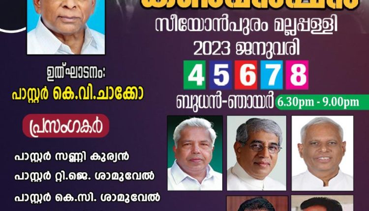 മല്ലപ്പള്ളി: ഐ.പി.സി. മല്ലപ്പള്ളി സെന്റർ അറുപത്തിയഞ്ചാമത് വാർഷിക കൺവൻഷൻ 2023 ജനുവരി 4 ബുധൻ മുതൽ 8 ഞായർ വരെ മല്ലപ്പള്ളി സീയോൻപുരം ഗ്രൗണ്ടിൽ നടക്കും. 4 ബുധൻ വൈകിട്ട് 5:30 നു ഉദ്ഘാടന സമ്മേളനം ആരംഭിക്കും. ഐ. പി. സി. മല്ലപ്പള്ളി സെന്റർ പ്രസിഡന്റ് പാസ്റ്റർ കെ. വി. ചാക്കോ ഉദ്ഘാടനം ചെയ്യും. ഐ. പി. സി. മല്ലപ്പള്ളി സെന്റർ വൈസ് പ്രസിഡന്റ് പാസ്റ്റർ വർഗ്ഗീസ് കുര്യൻ അധ്യക്ഷത വഹിക്കും. എ ജി. മലയാളം ഡിസ്ട്രിക്ട് സൂപ്രണ്ട് പാസ്റ്റർ ടി. ജെ. ശാമുവേൽ പ്രസംഗിക്കും. 5,6,7 തീയതികളിൽ വൈകുന്നേരം 6:30 നു ആരംഭിക്കുന്ന പൊതുയോഗങ്ങളിൽ പാസ്റ്റർമാരായ എബി പീറ്റർ(കോട്ടയം), സണ്ണി കുര്യൻ (വാളകം), എബി ഏബ്രഹാം (പത്തനാപുരം) എന്നിവർ പ്രസംഗിക്കും. പാസ്റ്റർ പ്രസാദ് വെണ്ണിക്കുളം നേതൃത്വം നൽകുന്ന ഡേവിഡ്സ് ഹാർപ്പ് ഗാനങ്ങൾ ആലപിക്കും. 8 ഞായർ രാവിലെ 8:30 മുതൽ മല്ലപ്പള്ളി സെന്ററിലെ സഭകളുടെ സംയുക്ത ആരാധന നടക്കും കർത്തൃമേശയും ഉണ്ടായിരിക്കും. പാസ്റ്റർ കെ. വി. ചാക്കോ നേതൃത്വം നൽകും. പാസ്റ്റർ കെ. സി ശാമുവേൽ പ്രസംഗിക്കും.