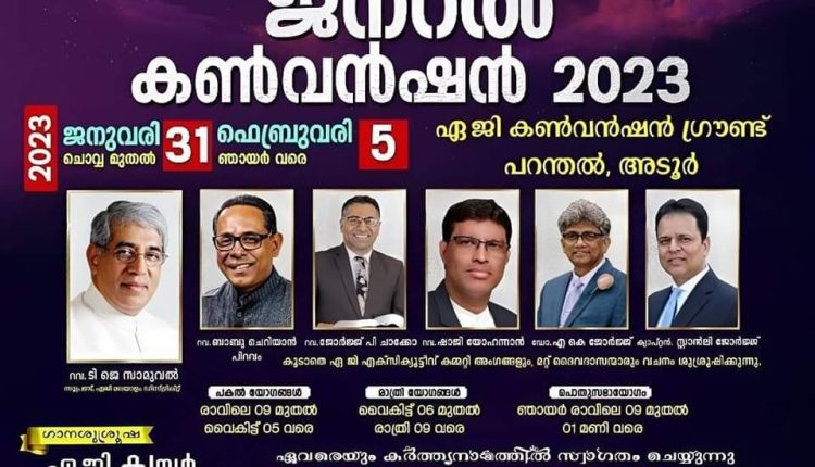 പുനലൂർ: അസംബ്ലീസ് ഓഫ് ഗോഡ് മലയാളം ഡിസ്ട്രിക്ട് ജനറൽ കൺവൻഷൻ ഒരുക്കങ്ങൾ പുരോഗമിക്കുന്നു. ജനുവരി 31 മുതൽ ഫെബ്രുവരി 5 വരെ അടൂർ-പറന്തൽ എ ജി കൺവൻഷൻ സെൻ്ററിലാണ് കൺവൻഷൻ നടക്കുന്നത്.