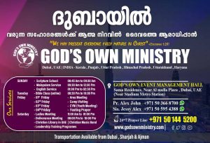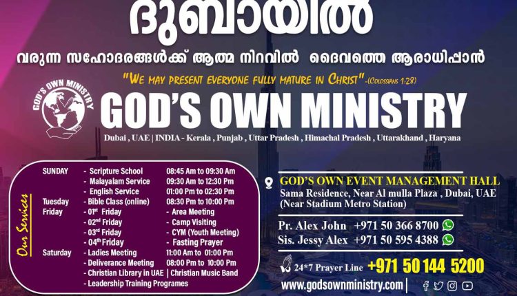 ദുബായ്: ദുബായിൽ വരുന്ന സഹോദരങ്ങൾക്ക് ആത്മനിറവിൽ ദൈവത്തെ ആരാധിക്കുവാൻ ‘ഗോഡ്സ് ഓൺ മിനിസ്ട്രി’. ദുബായ് അൽ മുള്ള പ്ലാസക്ക് സമീപമുള്ള സാമ റസിഡൻസിൽ (സ്റ്റേഡിയം മെട്രോ സ്റ്റേഷന് സമീപം)