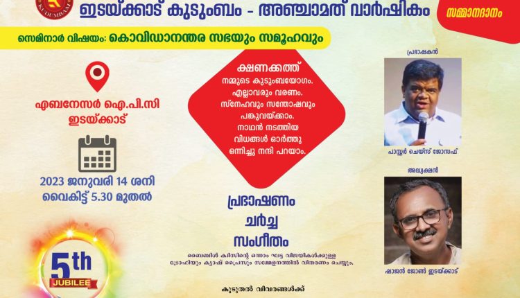 ഇടയ്ക്കാട്: ക്രിസ്തീയ സൗഹൃദ കൂട്ടായ്മയായ ഇടയ്ക്കാടു കുടുംബം കൂട്ടായ്മയുടെ അഞ്ചാമത് വാർഷികത്തോടനുബന്ധിച്ച് ഇന്ന് സെമിനാർ നടക്കും.
