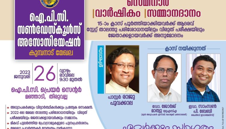 കുമ്പനാട്: ഐപിസി സണ്ഡേസ്കൂള്സ് അസോസിയേഷന് മേഖല അധ്യാപക-വിദ്യാര്ത്ഥി സെമിനാറും വാര്ഷിക സമ്മേളനവും ജനുവരി 26ന് 9.30ന് തിരുവല്ല ഐപിസി പ്രെയര് സെന്റര് ഹാളില് നടക്കും.