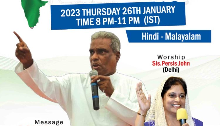 പ്രയർ ഡിപ്പാർട്ട്മെൻ്റും നോർത്തിന്ത്യാ മിനിസ്ട്രിയും സംയുക്തമായി നേതൃത്വം നല്കുന്ന ‘Pray for Bharath – ഭാരതത്തിനു വേണ്ടി പ്രാർത്ഥിക്കാം’ എന്ന പ്രാർത്ഥന യോഗം ജനുവരി 26 വൈകിട്ട് 8 മുതൽ 11 വരെ നടക്കും. സൂം പ്ലാറ്റ്ഫോമിലാണ് പ്രാർത്ഥന നടക്കുന്നത്.