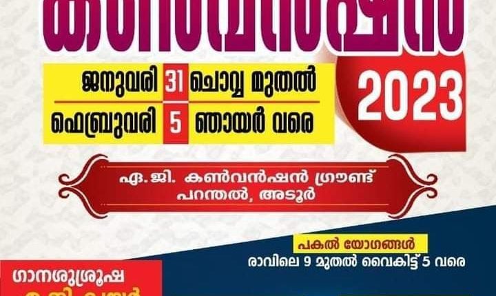 അടൂർ-പറന്തൽ: അസംബ്ലീസ് ഓഫ് ഗോഡ് മലയാളം ഡിസ്ട്രിക്ട് ജനറൽ കൺവൻഷൻ 2023 ജനുവരി 31 ചൊവ്വാഴ്ച്ച മുതൽ ഫെബ്രുവരി 5 ഞാറാഴ്ച്ച വരെ അടൂർ-പറന്തൽ അസംബ്ലിസ് ഓഫ് ഗോഡ് കൺവൻഷൻ ഗ്രൗണ്ടിൽ വച്ച് നടക്കും.