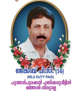 തിരുവല്ല: ദി പെന്തെക്കോസ്ത് മിഷൻ സഭയുടെ കൺവൻഷൻ പ്രാസംഗികനായിരുന്ന പരേതനായ പാസ്റ്റർ ജോസ് കാരയ്ക്കലിന്റെ സഹോദരനും റിഥം ഡ്യൂട്ടി പെയ്ഡ് ഉടമയുമായി മഞ്ഞാടി പണിക്കരുവീട്ടിൽ പുത്തൻപുരയ്ക്ക്ൽ പി.സി.ജേക്കബ് (റെജി 56) അന്തരിച്ചു. സംസ്കാരം ഇന്ന് രാവിലെ 7.30ന് വസതിയിലും തുടർന്ന് റ്റി.പി.എം തിരുവല്ല സെന്റർ സഭാ ഹാളിലെ ശുശ്രൂഷയ്ക്ക് ശേഷം 12ന് കിഴക്കൻ മുത്തൂർ റ്റി.പി.എം സെമിത്തേരിയിൽ. ഭാര്യ: ഭരണിക്കാവ് വാലുതറയിൽ ലിസി.