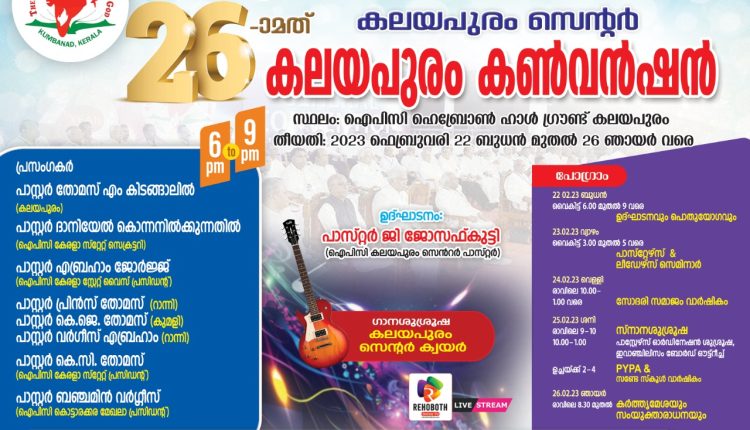 കലയപുരം: 26-മത് ഐ.പി.സി കലയപുരം സെന്റർ കൺവൻഷൻ 2023,ഫെബ്രുവരി 22 ബുധൻ മുതൽ17 ഞായർ വരെ ഐ.പി.സി ഹെബ്രോൻ( കലയപുരം )സഭയ്ക്ക് മുന്നിൽ തയ്യാറാക്കപ്പെട്ട പന്തലിൽ നടക്കും.ദിവസവും വൈകിട്ട് 6 മണി മുതൽ 9 മണി വരെയാണ് പൊതുയോഗങ്ങൾ നടക്കുക.