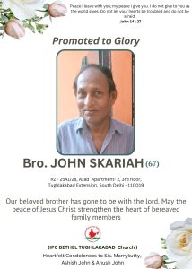 ഡൽഹി: പത്തനംതിട്ട ചക്കുത്തറ പരേതനായ സി സി ജോണിന്റെ മകൻ ജോൺ സ്കറിയ (രാജൻ -67) ഇന്നലെ ഫെബ്രുവരി 12ന് ഡൽഹിയിൽ വച്ചു നിത്യതയിൽ ചേർക്കപ്പെട്ടു. ദീർഘ വർഷങ്ങളായി ഡൽഹിയിൽ താമസമാക്കിയ പരേതൻ തുക്ക്ഗ്ലക്കാബാദ് ഐ പി സി ബെഥെൽ സഭാoഗമാണ്.