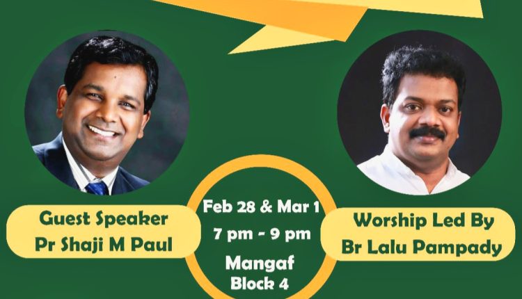 കുവൈറ്റ്: ഐപിസി ഫഹാഹീൽ കുവൈറ്റ് ദൈവസഭയുടെ നേതൃത്വത്തിൽ റിവൈവൽ 2023 (ഉണർവ് യോഗം) ഫെബ്രുവരി 28 മുതൽ മാർച്ച് 1 (ചൊവ്വ, ബുധൻ ) നടത്തപ്പെടുന്നു . ദൈവവചന ശുശ്രൂഷ പാസ്റ്റർ ഷാജി എം പോൾ നടത്തുന്നു. ഗാനശുശ്രൂഷ ബ്രദർ ലാലു പാമ്പാടി നയിക്കുന്നു.