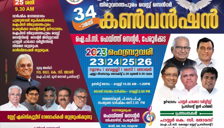 തിരുവനന്തപുരം: ഐ പി സി തിരുവനന്തപുരം വെസ്റ്റ് ഡിസ്ട്രിക് 34മത് കൺവനഷൻ 2023 ഫെബ്രുവരി 23 മുതൽ 26 വരെ ഐ.പി.സി ഫെയ്ത്ത് സെൻ്റർ പേരൂർക്കട സഭയിൽ വച്ച് നടത്തപ്പെടുന്നു. തിരുവനന്തപുരം വെസ്റ്റ് ഡിസ്ട്രിക് ഇൻചാർജ് പാ. ചാക്കോ വർഗീസ് ഉദ്ഘാടനം ചെയുന്ന മീറ്റിങ്ങിൽ പാസ്റ്റർമാരായ കെ സി തോമസ്, രാജു മേത്ര, രാജു പൂവക്കാല, വി പി ഫിലിപ്പ് എന്നിവർ പ്രസംഗിക്കുന്നു.