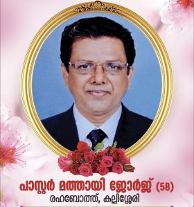പാസ്റ്റർ മത്തായി ജോർജിന്റെ (58) സംസ്കാരം തിങ്കളാഴ്ച കല്ലിശ്ശേരിയിൽ