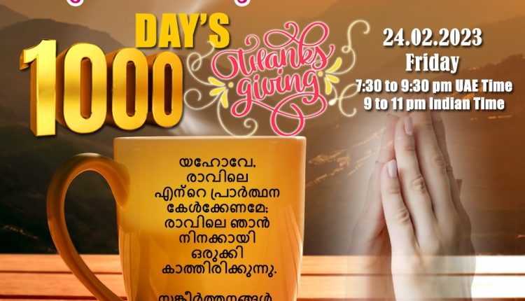 ഷാർജ: പ്രാർത്ഥനാസംഗമം (International Prayer Fellowship) ഒരുക്കുന്ന പ്രഭാത പ്രാർത്ഥനയുടെ 1000 ദിനം നാളെ പിന്നിടുകയാണ്. ഈ സന്തോഷ ദിനത്തിൽ ദൈവത്തോട് നന്ദി കരേറ്റുവാൻ ഇന്ന് രാത്രി (ഫെബ്രുവരി 24) 7.30 മണി മുതൽ 9.30 മണി വരെ (യു.എ.ഇ സമയം) താങ്ക്സ് ഗിവിങ് പ്രയർ നടക്കും. കോവിഡ് കാലത്ത് ആലയങ്ങളുടെ വാതിൽ അടഞ്ഞപ്പോൾ, ജനം ഭീതിയിൽ ആയപ്പോൾ 2020 ജൂൺ 1- തീയതി തുടങ്ങിയ പ്രഭാത പ്രാർത്ഥന ആയിരങ്ങൾക്ക് ആശ്വാസവും വിടുതലുമായി.