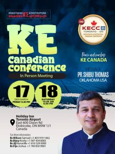 ടോറോന്റോ: ക്രൈസ്തവ എഴുത്തുപുര കാനഡ ഒരുക്കുന്ന രണ്ടാമത് കനേഡിയൻ കോൺഫറെൻസ് (KECC) 2023 മാർച്ച് മാസം 17, 18 തീയതികളിൽ Holiday Inn Toronto East 600 Dixon Road, Etobicoke വച്ച് നടത്തപ്പെടുന്നു.