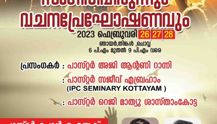 കോട്ടയം: ത്രിദിന ആറാണി കൺവൻഷന് ഇന്ന് 26 ഞായർ വൈകിട്ട് തുടക്കമാകും. മീനടം ആറാണിയിൽ നടക്കുന്ന സുവിശേഷ യോഗങ്ങളിൽ പാസ്റ്റർമാരായ അജി ആന്റണി, സജീവ് എബ്രഹാം, റെജി ശാസ്താംകോട്ട എന്നിവർ പ്രസംഗിക്കും. പാസ്റ്റർ പോൾ ഐസക് ശുശ്രൂഷകൾക്ക് നേതൃത്വം നൽകും. ബെഥാനിയ വോയ്സ് ഗാനങ്ങൾ ആലപിക്കും.