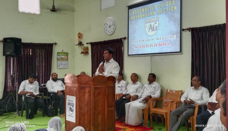 കായംകുളം: അസംബ്ലിസ് ഓഫ് ഗോഡ് കായംകുളം സെക്ഷന്റെ ഈ മാസത്തെ കൂട്ടായ്മ യോഗം ഞക്കനാൽ ബഥേൽ ഏ ജി ചർച്ചിൽ വെച്ച് അനുഗ്രഹമായി നടത്തപെട്ടു. സെക്ഷൻ സെക്രട്ടറി പാസ്റ്റർ രാജൻ യോഹന്നാൻ അദ്ധ്യക്ഷത വഹിച്ചു. ട്രഷറർ പാസ്റ്റർ പി എം ജോൺ സാക്ഷ്യത്തിന് നേതൃത്വം കൊടുത്തു. സങ്കീർത്തന പ്രബോധനം പാസ്റ്റർ കുരികേഷ് നിർവഹിച്ചു. സെക്ഷൻ പ്രസ്ബിറ്റർ റവ. ഫിന്നി ജോസഫ് നേതൃത്വം കൊടുത്ത കൂട്ടായ്മയിൽ സെക്ഷൻ സഭകളിൽ നിന്ന് നല്ല ഒരു കൂട്ടം ജനം വന്നു സംബന്ധിച്ചു. ആരാധനകൾക്ക് ലിജോ ഡേവിഡ്, പാസ്റ്റർ ഷിജു എം ആർ, ജോയൽ ബി ചാക്കോ, അലൻ എന്നിവർ നേതൃത്വം നൽകി. SIAG ചാരിറ്റി dept ഡയറക്ടർ പാസ്റ്റർ സജിമോൻ ബേബി മുഖ്യ സന്ദേശം നൽകി.