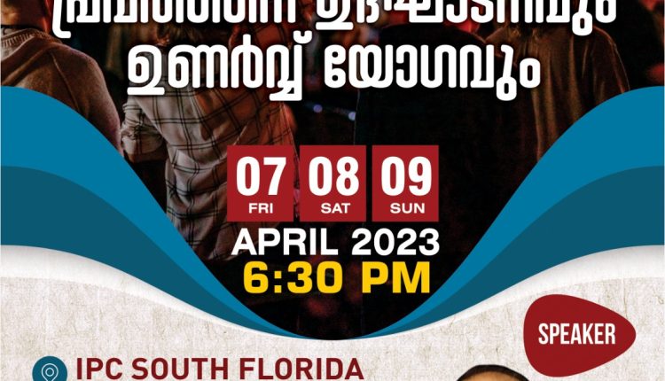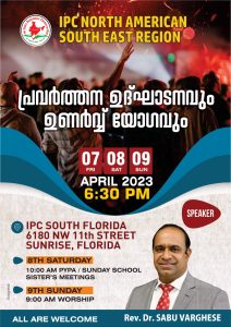 ഫ്ളോറിഡ: ഐപിസി നോർത്ത് അമേരിക്കൻ സൗത്ത് ഈസ്റ്റ് റീജിയൻ പുതുതായി തെരഞ്ഞെടുക്കപ്പെട്ട ഭരണസമിതിയുടെ പ്രവർത്തന ഉദ്ഘാടനവും സുവിശേഷ മഹായോഗവും 2023 ഏപ്രിൽ 7, 8, 9 തീയതികളിൽ ഐപിസി സൗത്ത് ഫ്ലോറിഡ ദൈവസഭയിൽ വച്ച് നടത്തപ്പെടും ( IPC SOUTH FLORIDA, 6180 NW 11 th STREET, SUNRISE, FLORIDA).