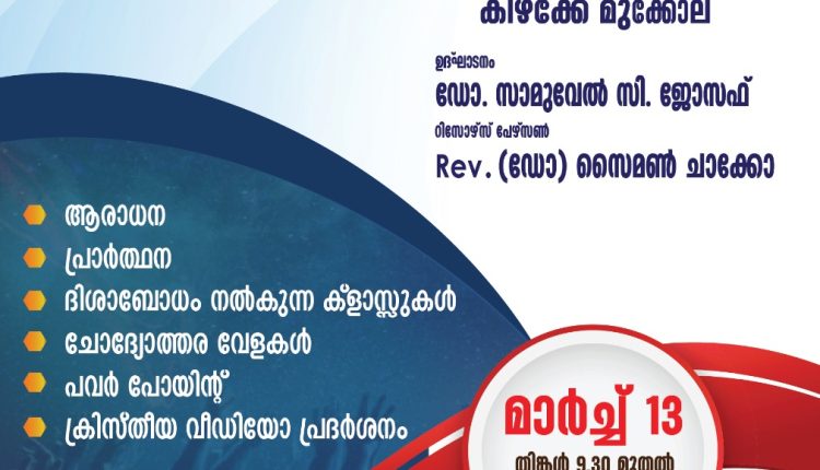 തിരുവനന്തപുരം: ഐപിസി തിരുവനന്തപുരം ഈസ്റ്റ് സെന്റർ ഒരുക്കുന്ന ശുശ്രുഷക കുടുംബ സംഗമം മാർച്ച് 13 തിങ്കളാഴ്ച രാവിലെ 9:30 മണി മുതൽ വൈകിട്ട് 5 മണി വരെ എലിം വർഷിപ്പ് സെന്റർ കിഴക്കേ മുക്കോലയിൽ വച്ച് നടക്കപ്പെടും. പ്രസ്തുത മീറ്റിംഗ് ഡോ: സാമൂവേൽ സി ജോസഫ് ഉദ്ഘാടനം ചെയ്യും.ഐപിസി തിരുവനന്തപുരം ഈസ്റ്റ് സെന്റർ ശുശ്രൂഷകൻ റവ ഡോ: സൈമൺ ചാക്കോ യുഎഇ ദൈവവചനത്തിൽ നിന്നും ശുശ്രൂഷിക്കും. പാസ്റ്റർ സാംകുട്ടി ദാനിയേൽ, പാസ്റ്റർ രാജേഷ് കുമാർ, പാസ്റ്റർ പ്രഭാകരൻ റ്റി തുടങ്ങിയവർ ഈ സമ്മേളനത്തിന് നേതൃത്വം നൽകും.