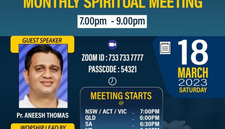മെൽബൺ: ഐ പി സി ഓസ്ട്രേലിയ റീജിയന്റെ ഈ മാസത്തിലെ മാസയോഗം മാർച്ച് പതിനെട്ടാം തീയതി ശനിയാഴ്ച്ച വൈകിട്ട് 7 മണി മുതൽ 9 മണി വരെ (സിഡ്നി- മെൽബൺ സമയം) ’സൂ’ മിലൂടെ നടക്കും.