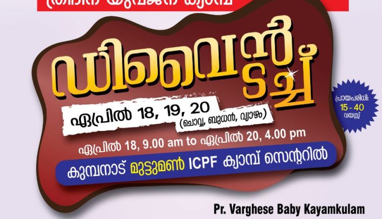 കുമ്പനാട്: ഡിവൈൻ പ്രയർ മിനിസ്ട്രീസ് ഇന്ത്യാ ഒരുക്കുന്ന ത്രിദിന യുവജന ക്യാമ്പ് ഏപ്രിൽ 18 ചൊവ്വ മുതൽ 20 വ്യാഴം വരെ നടക്കും.18 ന് രാവിലെ 9 മണി മുതൽ 20 ന് വൈകുന്നേരം 4 മണി വരെ കുമ്പനാട് മുട്ടുമൺ ICPF ക്യാമ്പ് സെന്ററിൽ വെച്ച് നടക്കും.