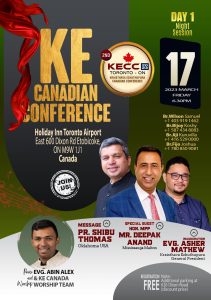 ടോറോന്റോ: ക്രൈസ്തവ എഴുത്തുപുര കാനഡ ചാപ്റ്ററിന്റെയും യൂണിറ്റുകളുടെയും ആഭിമുഖ്യത്തിൽ നടക്കുന്ന രണ്ടാമതു കനേഡിയൻ കോൺഫറെൻസ് (KECC) ഇന്ന് മുതൽ (Holiday Inn Toronto ഈസ്റ്റ്, 600 Dixon Road, Etobicoke) വച്ച് നടത്തപ്പെടുന്നു.