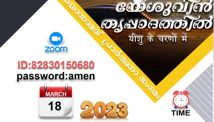 ഇരുപത്തിയൊന്നാമത് പ്രാർത്ഥനാ സംഗമം ഇന്ന് മാർച്ച് 18ന് ഇന്ത്യൻ സമയം രാത്രി 8.30-ന് ഓൺലൈനിൽ നടക്കും. പാസ്റ്റർ ഫെയ്ത്ത് ബ്ലെസ്സൺ മുഖ്യ സന്ദേശം നൽകും.