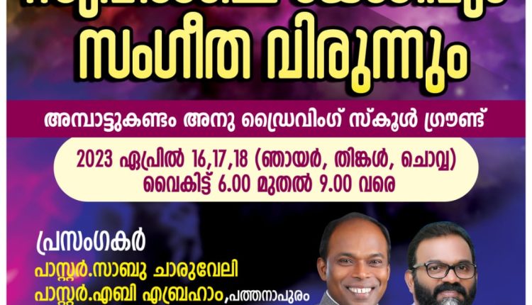 തൊടുപുഴ: ചർച്ച് ഓഫ് ഗോഡ് കേരള റീജിയൻ കുണിഞ്ഞി ഏബനേസ്സർ സഭയുടെ ആഭിമുഖ്യത്തിൽ സുവിശേഷ മഹായോഗവും സംഗീത വിരുന്നും ഏപ്രിൽ 16 ,17 ,18 തിയ്യതികളിൽ വൈകിട്ട് 6 മുതൽ 9 വരെ അമ്പാട്ടുകണ്ടം അനു ഡ്രൈവിംഗ് സ്കൂൾ ഗ്രൗണ്ടിൽ വച്ചു നടക്കും.