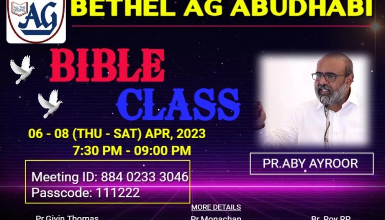 അബുദാബി : ബെഥേൽ അസംബ്ലി ഓഫ് ഗോഡ് അബുദാബി ചർച്ചിന്റെ നേതൃത്വത്തിൽ 2023 ഏപ്രിൽ 6,7, 8( വ്യാഴം – ശനി)ദിവസങ്ങളിൽ ദിവസവും വൈകിട്ട് 7: 30 മുതൽ 9:00 മണി വരെ സൂം പ്ലാറ്റ്ഫോമിലൂടെ ബൈബിൾ ക്ലാസുകൾ നടത്തപ്പെടുന്നു.അനുഗ്രഹീത കർതൃദാസൻ പാസ്റ്റർ എബി ഐരൂർ ക്ലാസുകൾക്ക് നേതൃത്വം നൽകും. മീറ്റിങ്ങുകൾക്ക് പാസ്റ്റർ ഗിവിൻ തോമസ്, പാസ്റ്റർ മോനച്ചൻ, ബ്രദർ റോയ് ആർ പി തുടങ്ങിയവർ നേതൃത്വം നൽകും.
