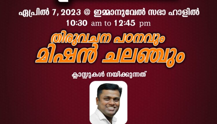 മണർകാട്: ഐപിസി ഇമ്മാനുവൽ മണർകാട് സഭാ ഹാളിൽ വെച്ച് ഏപ്രിൽ ഏഴാം തീയതി വെള്ളിയാഴ്ച രാവിലെ 10.30 മുതൽ പ്രത്യേക തിരുവചന പഠനം നടക്കും.