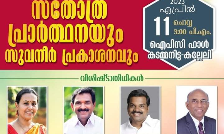കടമ്മനിട്ട : ഐപിസി കടമ്മനിട്ട കല്ലേലിമുക്ക് എബനേസർ സഭ നാല്പത് വർഷം പൂർത്തീകരിച്ചതിന്റെ ഭാഗമായി പ്രസിദ്ധീകരിച്ച സുവനീർ പ്രകാശനവും സ്തോത്ര പ്രാർത്ഥനയും ചാരിറ്റി പ്രവർത്തനവും പുതുതായി നിർമ്മിച്ച സ്നാന കുളത്തിന്റെ സമർപ്പണ പ്രാർത്ഥനയും ഇന്ന് ഏപ്രിൽ 11 ഉച്ചയ്ക്ക് 3 ന് സഭാ ഹാളിൽ നടക്കും.ഐപിസി ജനറൽ വൈസ് പ്രസിഡന്റ് പാസ്റ്റർ വിൽസൺ ജോസഫ്, ബഹു.ആരോഗ്യ വകുപ്പ് മന്ത്രി വീണ ജോർജ്, ബഹു.എം.പി.ആന്റോ ആന്റണി, കോന്നി എംഎൽഎ .ജനീഷ് കുമാർ, പാസ്റ്റർ മോൻസി സാം എന്നിവർ വിശിഷ്ടാതിഥികളായി പങ്കെടുക്കും.പാസ്റ്റർ സാം പനച്ചയിൽ അധ്യക്ഷത വഹിക്കും.ഐപിസി കടമ്മനിട്ട എബനേസർ ക്വയർ ഗാന ശുശ്രൂഷ നിർവഹിക്കും