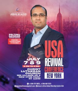ന്യൂയോർക്ക്: ജീസസ് ഈസ് എലൈവ് ഗ്ലോബൽ വർഷിപ്പ് സെന്ററിന്റെ ആഭിമുഖ്യത്തിൽ നടത്തപ്പെടുന്ന യു എസ് എ റിവൈവൽ കോൺഫറൻസ് ജൂലൈ 7 മുതൽ 9 വരെ ന്യൂയോർക്കിൽ വെച്ച് നടക്കും.