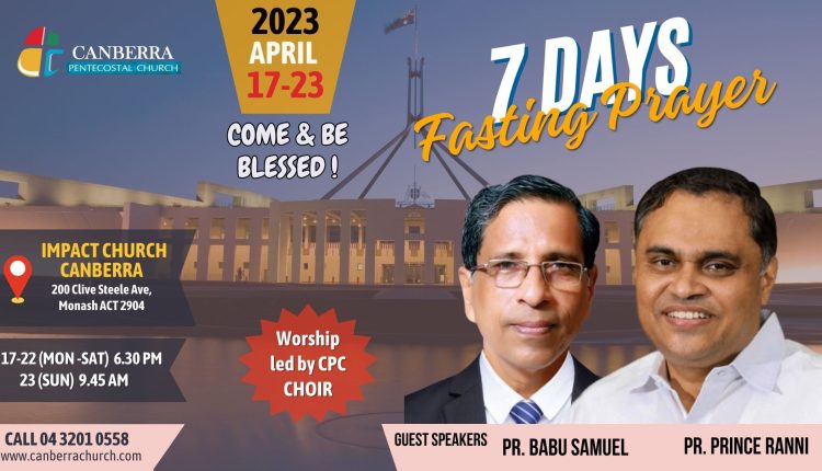 കാൻബറ: കാൻബറ പെന്തക്കോസ്ത് ചർച്ചിന്റെ ആഭിമുഖ്യത്തിൽ 7 ദിവസത്തെ ഉപവാസ പ്രാത്ഥന ഏപ്രിൽ 17 മുതൽ 23 വരെ കാൻബെറയിലെ ഇംപാക്റ്റ് ചർച്ചിൽ (Impact Church Canberra, 200 Clive Steele Ave, Monash ACT 2904) വച്ച് നടത്തപ്പെടുന്നു. ഉപവാസ പ്രാർത്ഥനയിൽ ആദ്യത്തെ മൂന്നു ദിവസം പൊതുയോഗങ്ങളായിട്ടാണ് ക്രമീകരിച്ചിരിക്കുന്നത്. എല്ലാ യോഗങ്ങളും വൈകിട്ട് 6.30ന് ആരംഭിക്കും.