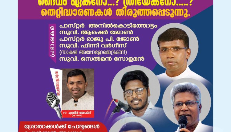 കോട്ടയം: ദൈവം ഏകനോ ത്രിയേകനോ എന്ന വിഷയം ആസ്പദമാക്കി ഇമ്മാനുവേൽ ഗോസ്പൽ മിനിസ്ട്രി ഒരുക്കുന്ന കോൺഫറൻസ് എപ്രിൽ 24 തിങ്കൾ മുതൽ 26 ബുധൻ വരെ ഇന്ത്യൻ സമയം രാത്രി 7 മുതൽ 9 വരെ സൂം പ്ലാറ്റ്ഫോമിൽ നടക്കും.