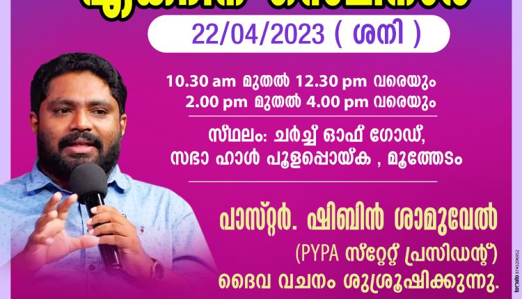 പി വൈ പി എ കേരള സ്റ്റേറ്റ് പ്രസിഡന്റ് സുവിശേഷകൻ ഷിബിൻ ശാമുവേൽ ദൈവ വചനം ശുശ്രൂഷിക്കും.