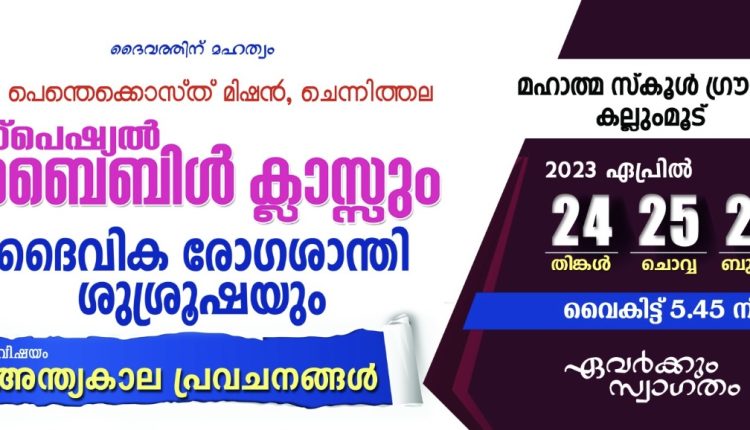 തിരുവല്ല: ദി പെന്തെക്കൊസ്ത് മിഷൻ ചെന്നിത്തല സഭയുടെ ആഭിമുഖ്യത്തിൽ സ്പെഷ്യൽ ബൈബിൾ ക്ലാസ് ഏപ്രിൽ 24 തിങ്കൾ മുതൽ 26 ബുധൻ വരെ കല്ലുംമൂട് മഹാത്മ സ്കൂൾ ഗ്രൗണ്ടിൽ വെച്ച് നടക്കും.