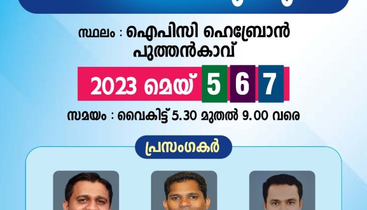 പുത്തൻകാവ്: ഐ പി സി ഹെബ്രോൻ പുത്തൻകാവ് സഭയുടെ ആഭിമുഖ്യത്തിൽ സഭാ ഗ്രൗണ്ടിൽ 2023 മെയ് 5,6,7 (വെള്ളി, ശനി, ഞായർ) ദിവസങ്ങളിൽ വൈകിട്ട് 5:30 മുതൽ രാത്രി 9 വരെ സുവിശേഷയോഗവും സംഗീത ശുശ്രൂഷയും നടത്തപ്പെടുന്നു.