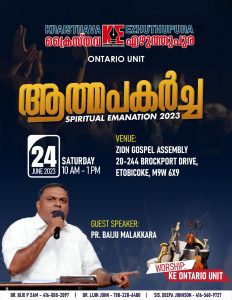 കാനഡ: ക്രൈസ്തവ എഴുത്തുപുര ഒന്റാറിയോ യൂണിറ്റ് ഏകദിന പവർ കോൺഫെറൻസ് “ആത്മപകർച്ച -2023” എന്ന പേരിൽ 2023 ജൂൺ 24 ശനിയാഴ്ച പ്രാദേശിക സമയം രാവിലെ 10:00 മണി മുതൽ ഉച്ചക്ക് 01:00 മണി വരെ സയോൺ ഗോസ്പൽ അസംബ്ലി ചർച്ചിൽ (20-244 Brockport Drive, Etobicok, M9W 6X9) വെച്ച് നടക്കും.