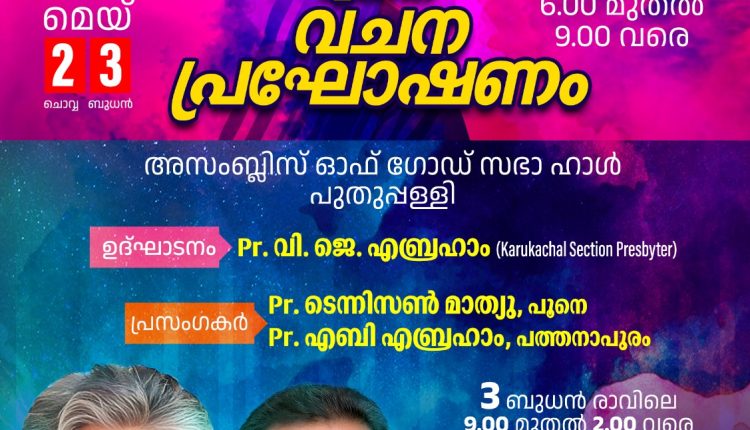 പുതുപ്പള്ളി: അസംബ്ലീസ് ഓഫ് ഗോഡ് പുതുപ്പള്ളി സഭയുടെ ആഭിമുഖ്യത്തിൽ മെയ് 2, 3 (ബുധൻ, വ്യാഴം) ദിവസങ്ങളിൽ സുവിശേഷ മഹായോഗവും സംഗീത വിരുന്നും പുതുപ്പള്ളി കന്നുകുഴി പാലത്തിനു സമീപമുള്ള സഭാ ഹാളിൽ വച്ച് നടക്കും.