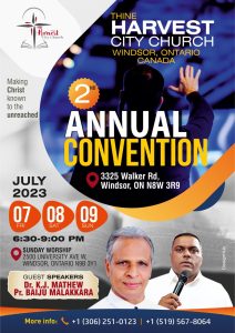 കാനഡ/ വിൻഡ്സർ : ദയിൻ ഹാർവെസ്റ്റ് സിറ്റി ചർച്ച് രണ്ടാമത് വാർഷിക കൺവെൻഷൻ ജൂലൈ 7 മുതൽ 9 വരെ വിൻഡ്സറിൽ വച്ച് നടക്കും. ദിവസവും വൈകിട്ടു 6:30 മുതൽ 9:00 വരെ നടക്കുന്ന യോഗങ്ങളിൽ സൗത്ത് ഇന്ത്യ അസ്സെംബ്ലിസ് ഓഫ് ഗോഡ് (SIAG) ജനറൽ സെക്രട്ടറി റവ. ഡോ കെ ജെ മാത്യുവും പാസ്റ്റർ ബൈജു മാലക്കരയും ദൈവ വചനത്തിൽ നിന്നും സംസാരിക്കും. ഹാർവെസ്റ്റ് വർഷിപ്പേഴ്സ് ആരാധനാ ശുശ്രുഷകൾ നയിക്കും. സഭാ ശുശ്രുഷകരായ പാസ്റ്റർ ഷിനു തോമസ്, ഇവാ. എബിൻ അലക്സ് തുടങ്ങിയവർ വിവിധ ശുശ്രുഷകൾക്ക് നേതൃത്വം നൽകും