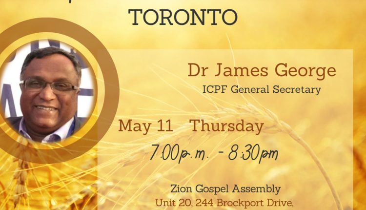 കാനഡ / ടൊറന്റോ: ഇന്റർ കോളജിയറ്റ് പ്രെയർ ഫെലോഷിപ് (ഐ.സി.പി.എഫ്) ഒരുക്കുന്ന പ്രമോഷണൽ മീറ്റിംഗ് 2023 മെയ് 11 വ്യാഴാഴ്ച വൈകിട്ട് 7:00 ന് സയോൺ ഗോസ്പൽ അസ്സെംബ്ലി ചർച്ചിൽ വെച്ച് നടക്കും.