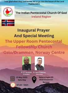 നോർവേ: ഐ.പി.സി അയർലൻഡ് റീജിയന്റെ കീഴിൽ നോർവേയിൽ പുതിയ പ്രവർത്തനം ആരംഭിക്കുന്നു. കൂട്ടായ്മയുടെ ഉദ്ഘാടനം മേയ് 13ന് ശനിയാഴ്ച രാവിലെ 10 മണി മുതൽ 12 മണി വരെ നോർവേയിലെ ഡ്രാമെനിൽ വച്ച് നടക്കും. ഐപിസി അയർലൻഡ് റീജിയൻ പ്രസിഡന്റ് പാസ്റ്റർ സി റ്റി എബ്രഹാം ഉദ്ഘാടനം നിർവഹിക്കും. ഐ.പി.സി അയർലണ്ട് റീജിയൺ സെക്രട്ടറി പാസ്റ്റർ സാനു മാത്യു അധ്യക്ഷത വഹിക്കും.