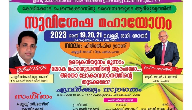 കോഴിക്കോട്: കോഴിക്കോട് പെന്തെക്കോസ്തു ദൈവസഭ ഒരുക്കുന്ന സുവിശേഷ മഹായോഗം