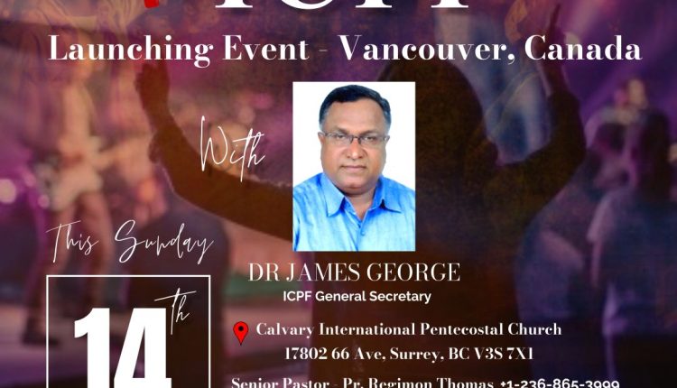കാനഡ/ വാൻകൂവർ: ഐ.സി.പി.എഫ്(ICPF) ബ്രിട്ടീഷ് കൊളമ്പിയ ലോഞ്ചിങ് മെയ് 14 ന് വൈകുന്നേരം 4 മണിക്ക് വാൻകൂവറിൽ വച്ച് നടക്കും. കാൽവരി ഇന്റർനാഷണൽ പെന്റകോസ്റ്റൽ ചർച്ചിൽ വച്ചു നടക്കുന്ന മീറ്റിംഗിൽ സീനിയർ പാസ്റ്റർ റെജിമോൻ തോമസ് അധ്യക്ഷത വഹിക്കുകയും ഐ.സി.പി.എഫ് ജനറൽ സെക്രട്ടറി ഡോ. ജെയിംസ് ജോർജ് ലോഞ്ചിങ് നിർവഹിക്കുകയും ചെയ്യും.