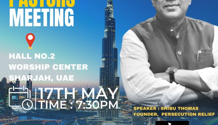 ഷാർജ: ഷാർജയിലുള്ള പാസ്റ്റർമാരുടെ സമ്മേളനം നാളെ (മെയ് 17ന്) ഷാർജയിൽ നടക്കും. വൈകിട്ട് 7.30 മുതൽ ഷാർജ വാർഷിപ് സെന്റർ ഹാൾ നമ്പർ 2ൽ വച്ച് നടക്കുന്ന യോഗത്തിൽ പെർസിക്യൂഷൻ റിലീഫ് സ്ഥാപകൻ ഇവാ. ഷിബു തോമസ് മുഖ്യ അതിഥിയായി ദൈവവചനത്തിൽ നിന്നും സംസാരിക്കുമെന്ന് ഭാരവാഹികൾ അറിയിച്ചു.