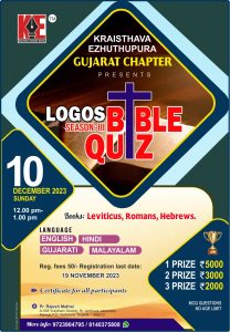 ക്രൈസ്തവ എഴുത്തുപുര ഗുജറാത്ത് ചാപ്റ്റർ ലോഗോസ് ബൈബിൾ ക്വിസ് സീസൺ – 3 ഡിസംബർ 10 ന്