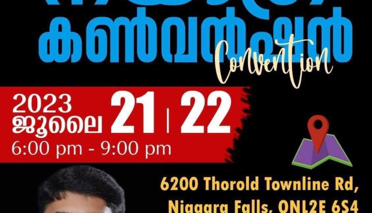 കാനഡ: ചരിത്ര പ്രസിദ്ധമായ നയാഗ്ര പട്ടണത്തിൽ നയാഗ്ര പ്രയർ സെന്ററിന്റെ ആഭിമുഖ്യത്തിൽ നയാഗ്ര കൺവൻഷൻ നടത്തപ്പെടുന്നു. ജൂലൈ 21, 22 ( 6. pm-9pm) തീയതികളിൽ പട്ടണത്തിന്റെ ഹൃദയ ഭാഗത്തുള്ള 6200 Thorold to town line Rd, Niagara Falls ONL 2 E654 കൺവൻഷൻ സെന്ററിൽ നടത്തപ്പെടുന്നു.