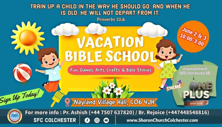 കോൾചെസ്റ്റർ: ശാരോൻ ഫെലോഷിപ്പ് ചർച്ച് കോൾചെസ്റ്ററും എക്സൽ ഇന്റർനാഷ്ണൽ വി.ബി.സ് മിനിസ്റ്റ്ട്രിസും ചേർന്ന് ജൂൺ 2,3 തിയതികളിൽ രാവിലെ 10 മണി മുതൽ വൈകിട്ട് 3 മണി വരെ കുഞ്ഞുങ്ങൾക്കായ് രണ്ട് ദിവസത്തെ വേക്കേഷൻ ബൈബിൾ സ്കൂൾ ഒരുക്കുന്നു. വൺ പ്ലസ് നെവർ എലൊൺ എന്നതാണ് തീം. ഗെയിംസ്, പാട്ടുകൾ, കഥകൾ, ക്രാഫ്റ്റ് വർക്കുകൾ, മിഷൻ ചലഞ്ഞ്, തുടങ്ങിയവയാണ് പ്രതേകതകൾ. പ്രവേശനം സൗജന്യം.