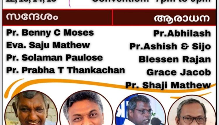 പ്രാർത്ഥനയുടെ 1000 പ്രഭാതങ്ങൾ പിന്നിടുമ്പോൾ, മോർണിംഗ് പ്രയർ ക്ലബ്ബിൻ്റെ ആഭിമുഖ്യത്തിൽ ജൂൺ 12 മുതൽ 15 വരെ വൈകുന്നേരം 7 മുതൽ 9 വരെ ഓൺലൈൻ കൺവൻഷൻ നടക്കുന്നു. അഭിഷിക്ത ദൈവദാസന്മാരായ പാസ്റ്റർ ബെന്നി സി മോസസ്, ഇവാ. സാജു ജോൺ മാത്യു, പാസ്റ്റർ സോളമൻ പൗലോസ്, പാസ്റ്റർ പ്രഭാ റ്റി തങ്കച്ചൻ എന്നിവർ വചനം സംസാരിക്കും .