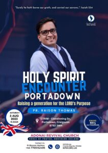 പോർട്ടഡൗൺ (യു കെ): ആഡോണായി റിവൈവൽ ചർച്ച് – ഹൗസ് ഓഫ് പ്രയർ, IAGUK, നോർത്തേൺ അയർലണ്ട് ആഭിമുഖ്യത്തിൽ “ഹോലിസ്പിരിറ്റ് എൻകൗണ്ടർ” കൂട്ടായ്മ പോർട്ടഡൗണിൽ ഓഗസ്റ്റ് 5ന് നടക്കും. പാസ്റ്റർ റെയ്സൺ തോമസ് ദൈവവചനത്തിൽ നിന്നും സംസാരിക്കുന്നു. പാസ്റ്റർ ഡെന്നി ജോൺ സംഗീത ശുശ്രുഷകൾക്ക് നേതൃത്വം നൽകുന്നു. ആഡോണായി റിവൈവൽ സഭാ ശുശ്രുഷകൻ പാസ്റ്റർ ബ്ലെസ്സൻ മാത്യു ശുശ്രുഷകൾക്ക് നേതൃത്വം നൽകുന്നു.