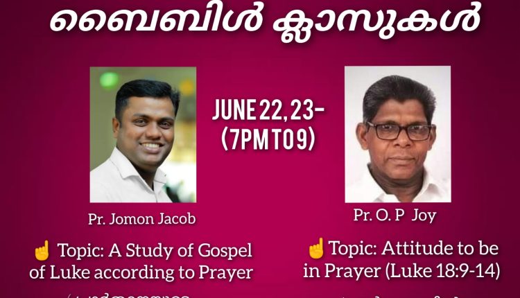 മണർകാട്: ഐ.പി.സി മണർകാട് ഇമ്മാനുവേൽ സഭയിൽ ഈ മാസം തുടർന്നുകൊണ്ടിരിക്കുന്ന ചെയിൻ പ്രയറിന്റെ ഭാഗമായി നടത്തപ്പെടുന്ന ബൈബിൾ ക്ലാസുകൾ ജൂൺ 22, 23 തീയതികളിൽ 7.15 pm to 9 pm വരെ സഭാ ഹാളിൽ വച്ച് നടത്തപ്പെടുന്നു. പ്രാർത്ഥനയുമായി ബന്ധപ്പെട്ട തിരുവചന പഠനത്തിനാണ് പ്രാധാന്യം നൽകുന്നത്.