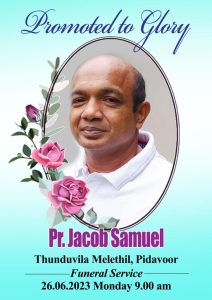 പത്തനാപുരം: ഇന്ത്യ പെന്തകോസ്ത് ദൈവസഭ കൊല്ലം കുണ്ടറ പെരുമ്പുഴ സഭാ ശുശ്രൂഷൻ പാസ്റ്റർ ജേക്കബ് സാമുവേൽ (55) നിത്യതയിൽ പ്രവേശിച്ചു. കഴിഞ്ഞ 20 വർഷം കർത്താവിന്റെ മഹിമ ഏറിയ സുവിശേഷ വേലയിൽ ആയിരുന്നു.